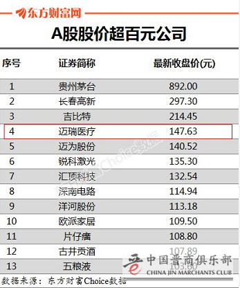 就算放到整个A股市场,迈瑞医疗也是属于“贵”的那一部分,其股价排在第4位,只低于贵州茅台、长春高新和吉比特。