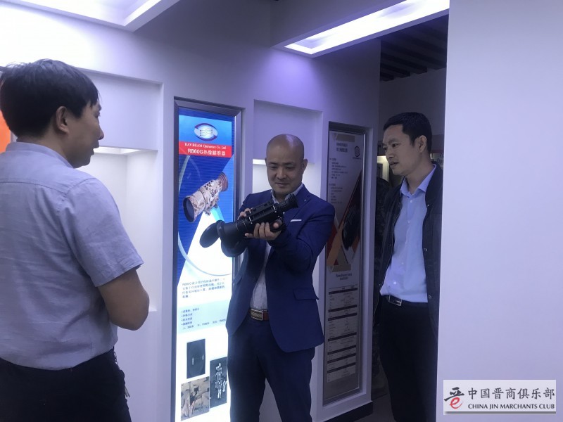 戎邦光电副总经理徐宝庆向中国晋商俱乐部一行介绍了公司的主要生产设备,并参观公司产品展厅,向大家展示了非制冷红外热像仪系列、激光测光测距仪系列、激光探测仪系列、望远镜系列。
