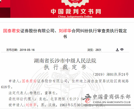 刘祥华在规定的期限内未能提前回购、偿还负债,于是国泰君安就把刘祥华给告了。