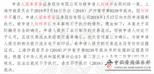 然而事情还没有完,奇葩的一幕来了,刘祥华一直没有还钱,国泰君安请求法庭强制执行,结果刘祥华耍起了流氓,说你不能这么做,你的证据是伪造的!