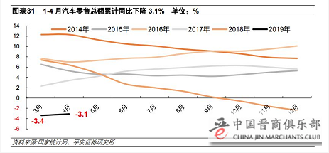 据中国统计局近期披露的社会消费品零售额数据及工业增加值数据显示,1-4 月份汽车是 41 个大类行业唯一增加值同比下降的(1-4 月汽车工业增加值累计同比下降 0.3%),1-4 月份汽车消费零售额同比下降 3.1%,从 2018 年 5 月以来,汽车消费零售额已连续 11 个月同比下滑。