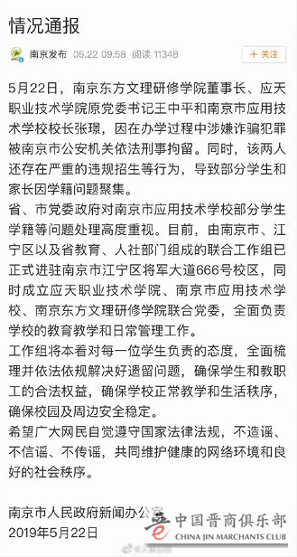 22日,南京东方文理研修学院董事长、应天职业技术学院原党委书记王中平和南京市应用技术学校校长张璟,因在办学过程中涉嫌诈骗犯罪被南京市公安机关依法刑事拘留。同时,该两人还存在严重的违规招生等行为,导致部分学生和家长因学籍问题聚集。