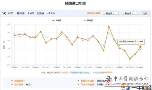 此外,外贸数据还显示,4月,韩国进口增长2.4%,好于分析师平均预期的0.3%,如下图所示: