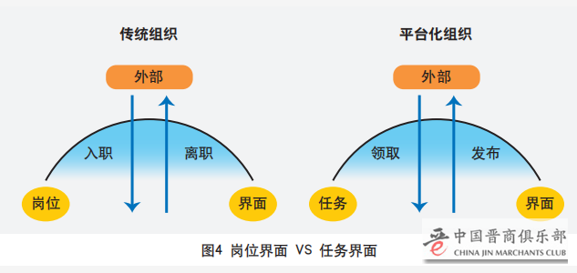 传统人力资源体系与员工的界面是“岗位”。人员要通过入职流程和离职流程和企业发生联系。但在新体系下,界面变成“任务”,入职可以通过注册实现。但注册成功,员工只是表面上具备领取任务的资格,企业对这个资格进行了认定。企业与员工之间的界面转变成了任务界面(如图4所示)。这就是平台组织(平台+个人)的界面:平台提供任务、资源、奖金,个人完成任务,领取奖金。
