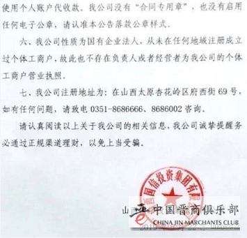 山西资本圈注意到,由于集团官网暂停运行而链接直接转向的该则声明显示,主要涉及七大方面,除明确公司官网地址、公司名称、注册商标、企业性质和注册地址外,山西国信集团表示迄今为止从未在集团公司层面发行任何理财产品,也没有任何以集团公司名义开设线上理财网站或手机理财APP,更没有开设其他任何外地账户和允许使用个人账户代收款。