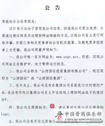 近日,山西国信集团发布一则公告显示,因有不法分子冒用山西国信集团信息,伪造公司营业执照,主要通过微信转发非法理财网站链接的方式,以公司名义进行网络诈骗,目前已有相关受害者向公安机关报案,为避免更多投资者上当受骗,特发郑重声明。