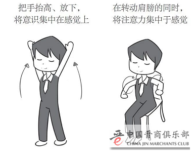 转动一次后,反方向再次转动肩膀,以同样的方式集中注意力。