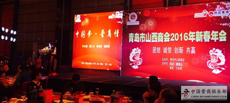 中国晋商俱乐部联合发起机构之青岛市山西商会2016年新春年会以克强总理归纳的晋商精神宣传拉开帷幕,20余家会员单位的年货产品展示实现会员内部供求零对接,36家青岛市异地商会会长、秘书长、2家异地山西商会会长及山西各届人士参加了本次活动。