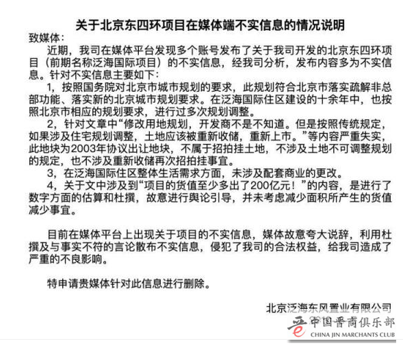 今天晚些时候,泛海集团旗下负责东四环项目开发的项目公司--“北京泛海东风置业有限公司”致有关媒体的“说明”,也正好印证了这则自媒体“惊掉北京地产商下巴”的报道纯属误传、臆猜和不了解项目具体情况的乌龙罢了。