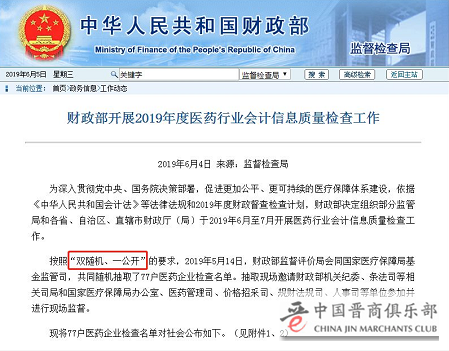 6月4日,财政部官网消息,开展2019年度医药行业会计信息质量检查工作。按照“双随机、一公开”的要求(随机抽取检查对象,随机选派执法检查人员,抽查情况及查处结果及时向社会公开),检查将持续到7月。
