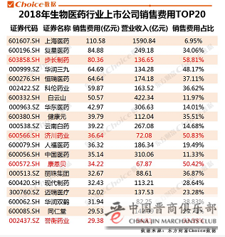 这其中,销售费用占营收比值超过50%的有35家,中位数高达21%。上海医药的销售费用高达110.58亿元,销售费用TOP20的医药生物上市公司,销售费用的平均占比是31.60%。步长制药、济川药业、康恩贝、誉衡药业均超过50%。