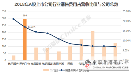 东方财富Choice数据显示,2018年,A股上市一共有医药生物行业上市公司296家,年报显示其销售费用占营收的比值平均是17.03%,在所有申万行业里面排名第二,仅次于休闲服务行业。