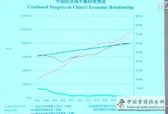 我特地给大家做了一张图,来说明中国经济再平衡是持续推进的过程。这条线(应是红线)是人均GDP水平,黄线是消费对经济增长的贡献率,蓝线是城市化率,紫线是服务业对经济增长的贡献率,底下的这条绿线是经常项目顺差占GDP的比重。