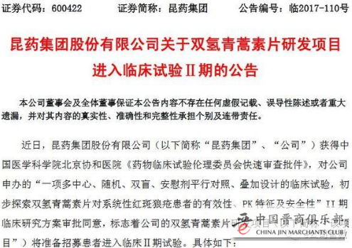 早在2017年12月14日,昆药集团就已公告,双氢青蒿素片研发项目进入临床试验Ⅱ期。昆药集团表示,公司获得中国医学科学院北京协和医院《药物临床试验伦理委员会快速审查批件》,对公司申办的“一项多中心、随机、双盲、安慰剂平行对照、叠加设计的临床试验,初步探索双氢青蒿素片对系统性红斑狼疮患者的有效性、PK特征及安全性”II期临床研究方案审批同意,标志着公司的双氢青蒿素片研发项目将准备招募患者进入临床Ⅱ期试验。