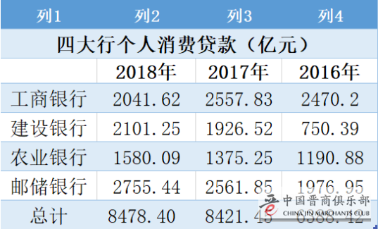 首先来看四家国有大行,整体而言,国有大行的个人消费贷款增长明显放缓。除了交通银行和中国银行未公布相关数据以外,去年年末四家国有大行的个人消费贷款余额总额为8478.4亿元,较上年同期仅增长了0.68%。而回到2017年,这一增速为同比增长了31.8%。