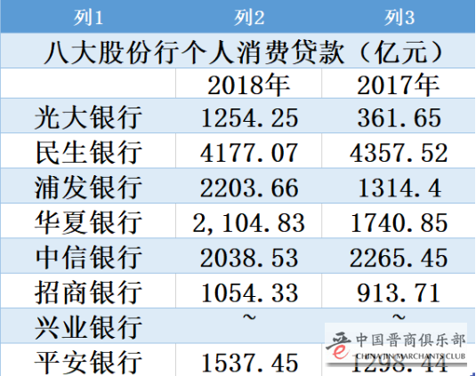 去年已上市的全国性股份行个人消费贷款增速分化较为明显,在8家已上市的股份行中,兴业银行未披露相关数据。光大银行去年个人消费贷款余额猛增246.8%,突破千亿规模,达到1254.25亿元。而在7家已披露相关数据的股份行中,个人消费信贷规模最大的是民生银行,在去年末达到了4177.07亿元,但却比2017年末下降了180.45亿元,同比降幅为4.14%。浦发银行去年个人消费贷款增速在7家股份行中位居第二,同比增长了67.66%至2203.66亿元。华夏银行去年个人消费贷款余额同比增长了20.9%。