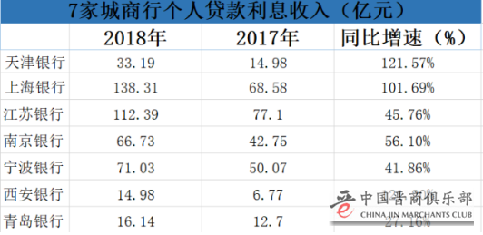 实际上,个人消费贷款的突飞猛进也给上市城商行带来了颇丰的收益,大多数银行虽然未公布具体的个人消费贷款利息收入,但是我们可以从个人贷款的利息收入中窥见一斑。去年,天津银行、上海银行等7家银行的个贷利息收入总和为452.8亿元,同比增长65.88%。其中,天津银行的个人贷款利息收入为33.19亿,同比增幅为121.57%,增速位列7家银行之首。