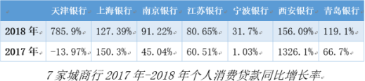 记者罗列了七家城商行近两年来个人消费贷款增长的数据,发现其大部分增势都相当迅猛,而到了2018年仍有加速的趋势。其中,天津银行2017年的个人消费贷款增长率为负,但是到了2018年,增速达到了惊人的785.9%。天津银行表示,个人消费贷款的突飞猛进主要是由于该行在2018年调整了资产结构。