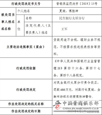 内容显示,民生银行太原分行此次招致重磅罚单的主要缘由在于贷款用途不合规,理财业务不规范,不按要求报送报表报告等资料,山西银保监局依据《中华人民共和国银行业监督管理法》第四十六条、第四十七条、第四十八条规定,对民生银行太原分行责令改正,罚款480万元。对副行长夏斌、金融市场部总经理傅胜坤警告。
