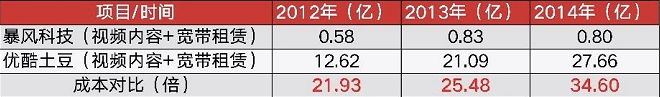 2012-2014年,暴风科技的成本分别为0.58亿元、0.83亿元、0.8亿元,而同期的优酷土豆的成本分别为12.62亿元、21.09亿、27.66亿元。也就是说,优酷土豆的投入分别是暴风科技的21.93倍、25.48倍、34.6倍。