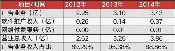 视频网站的经典盈利模式为“免费+广告”,即提供免费的视频服务,积累海量用户后进而产生广告投放价值。所以,广告是暴风的主要收入,2012年-2014年,暴风的广告收入占比分别为89.29%、95.38%、88.86%。