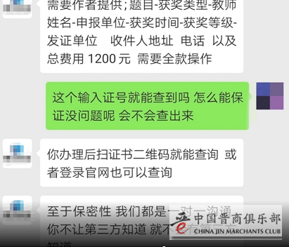 记者表示想要“全国教育发展研究成果大赛获奖证书”,“王老师”说,费用1200元,提供题目、获奖类型、教师姓名、申报单位、获奖时间和等级就可以了。