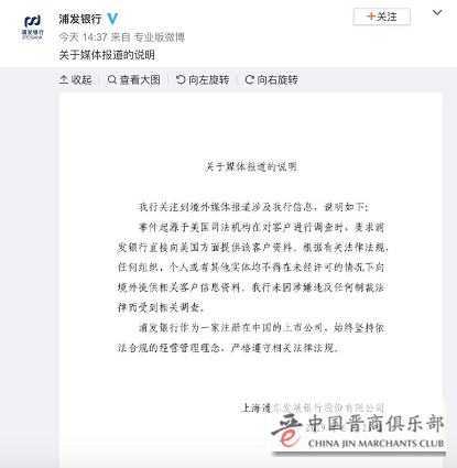 浦发银行回应称,该事件起源于美国司法机构在对客户进行调查时,要求浦发银行直接向美国方面提供该客户资料。根据有关法律法规,任何组织、个人或者其他实体均不得在未经许可的情况下向境外提供相关客户信息资料。我行未因涉嫌违反任何制裁法律而受到相关调查。作为一家注册在中国的上市公司,浦发银行始终坚持依法合规的经营管理理念,严格遵守相关法律法规。