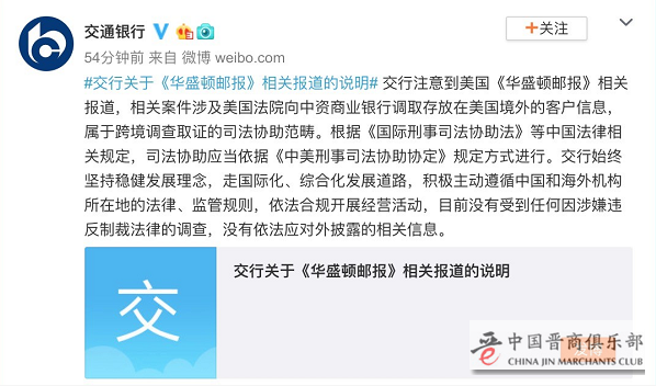 交通银行则表示,注意到美国《华盛顿邮报》相关报道,相关案件涉及美国法院向中资商业银行调取存放在美国境外的客户信息,属于跨境调查取证的司法协助范畴。根据《国际刑事司法协助法》等中国法律相关规定,司法协助应当依据《中美刑事司法协助协定》规定方式进行。交行始终坚持稳健发展理念,走国际化、综合化发展道路,积极主动遵循中国和海外机构所在地的法律、监管规则,依法合规开展经营活动,目前没有受到任何因涉嫌违反制裁法律的调查,没有依法应对外披露的相关信息。