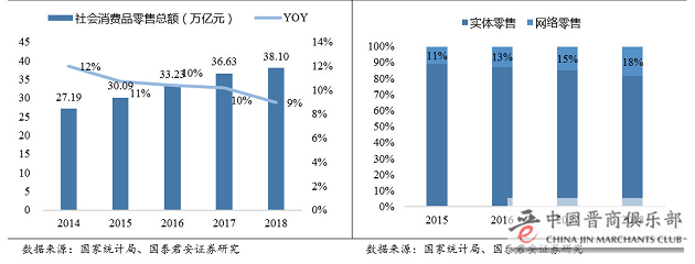 据国家统计局数据显示,2018年全年,中国社会消费品总额已达38万亿元,其中网络零售占比仅有18%,实体零售仍然占据社零总额的80%以上。