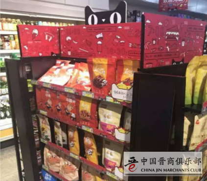 在店内的商品展示上,除了增加了一列天猫专用货架,用以摆放天猫网红零食之外,店头还增加了一些关东煮、包子等鲜食。