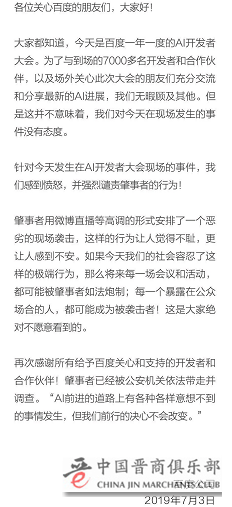 7月3日晚间消息,百度在微博上回应“李彦宏被泼水”事件。百度称,“对今天发生在AI开发者大会现场的事件,我们感到愤怒,并强烈谴责肇事者的行为!”百度还表示,肇事者已经被公安机关依法带走并调查。(新浪科技)