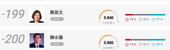 岛内网络数据分析平台公布的数据显示,台湾地区领导人蔡英文的好评影响力排行(好感度)列第199名,好评影响力分数仅5.940,仅高于台湾地区前领导人陈水扁一名,但与鸿海前董事长郭台铭、高雄市长韩国瑜差距很大。