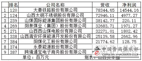 另外7家公司分别为:山煤集团旗下的山煤国际(239)、 焦煤集团旗下的西山煤电(271)、阳煤集团旗下的阳泉煤业(269)和阳煤化工(384)、潞安集团旗下的潞安环能(338)及永泰控股旗下的永泰能源(374)、山西首富杨建新旗下的跨境通(387)。