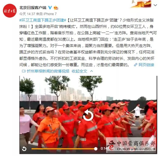 全国多地开启“烧烤模式”。然而在山西忻州,约60位男女环卫工人,身穿橘红色工作服,踏着音乐节拍,在公路上高喊“一二一”走方阵。