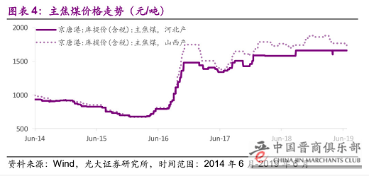 2019年上半年,焦煤的价格延续2018年的平稳态势,是近几年来的较高位水平。2018年京唐港主焦煤均价为1764元/吨,涨幅13.44%,2018年年内最高价与最低价价差为280元/吨,价格波幅为17.5%。2019年上半年,京唐港主焦煤价格均价1,659.51元/吨、期间内最高价1,660元/吨,最低价1,600元/吨。焦煤的下游是焦炭、钢铁企业,随着钢铁企业的盈利压缩,经营压力逐步向煤炭、煤焦企业传导,通过产业链进行利益再分配,焦煤的价格中枢存在下移的压力。