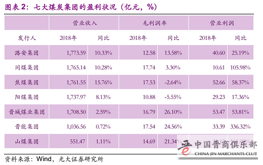 煤价高企的2018年,煤炭企业的经营业绩亮眼。从营业收入的角度来看,原有五大煤炭集团的规模均在1700亿以上,其次为晋能集团的1036.56亿元,最小规模是山煤集团的551.47亿元。从毛利润率的角度看,七大企业之间毛利润率水平差异较小,最高是同煤集团的17.74%,最低是阳煤集团的10.88%。从营业利润的角度看,企业之间差异较大,最高是晋城煤业集团53.47亿元,最低是同煤集团的10.61亿元。2018年七大煤炭集团的盈利持续改善,营业收入、营业利润实现同比增长,最高增长幅度分别可达15.76%、336.32%,毛利润率整体维持较高的水平。