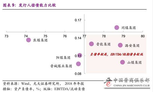 虽然当前煤炭企业的盈利表现较好,但是从短期偿债压力来看,偿债压力仍存在,从EBITDA/流动负债这个指标来看,整体的水平较低。微观层面,我们结合EBITDA/流动负债、资产负债率这两个指标来看,山煤集团、晋能集团、潞安集团在七大煤炭集团中处于相对较弱的水平。虽然同煤集团的资产负债率仍较高,但EBITDA/流动负债相对其他企业较高。