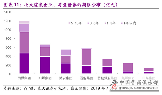 企业的融资需求主要为补充流动资金,重点煤炭集团的新发行债券仍以短期融资为主,截至2019年7月5日,七大煤炭集团合计发行新债1050.70亿元,发行期限小于等于1年的规模占比56%,主要用途为补充营运资金或偿还有息债务。从存量债的规模来讲,同煤、阳煤、潞安的一年内到期债券存量较大,这意味着企业需要充裕的流动资金作为偿债备付。