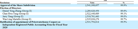 此次股东大会除了拆股方案外,阿里巴巴集团也重选了4名董事,包括香港前特首董建华、雅虎创办人杨致远、雀巢集团前执行副总裁龚万仁、阿里巴巴行政总裁张勇,而张勇是这次唯一由阿里巴巴合伙人团队提名的董事。