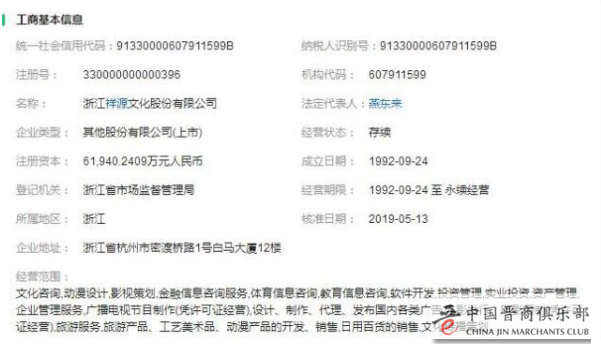 根据企查猫工商信息,浙江祥源文化股份有限公司成立于1992年9月24日,2017年9月14日由“浙江万好万家文化股份有限公司”改至现名,注册资本61940.2409万元人民币,法定代表人燕东来,经营范围包括文化咨询、动漫设计、影视策划、金融信息咨询服务等。