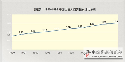 这是上个世纪90年代新出生婴儿里面性别比例不断的失衡。从1980年开始中国新出生婴儿103个男孩对100个女孩,1990年是111个男孩对应100个女孩,1999年达到了高峰123个男孩对100个女孩。