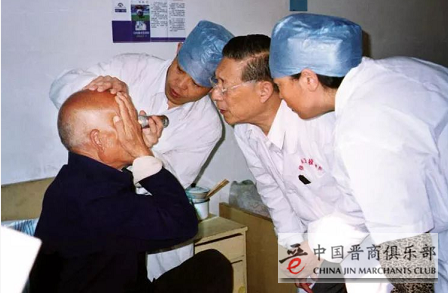 张效房(右二)在为患者进行眼部检查(资料照片)。新华社发