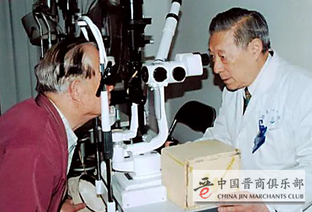 张效房(右)在为患者进行眼部检查(资料照片)。新华社发