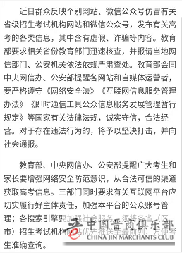 三部门同时要求有关互联网平台应切实履行好主体责任,加强本平台的公众账号管理;各搜索引擎要加强社会服务,须将各省(区、市)招生考试机构网站优先推送至最前列,方便考生准确查询。