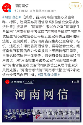 据河南省互联网信息办公室6月24日发布的通报,接举报,“河南招生考试办公室”“河南招生考试网” “河南省招生考试院”“河南省考试院”“河南考试招生”等5家微信公众号违反国家有关互联网法律法规,违规关联、冒用河南省招生办公室名称、标识,违规发布河南省高招信息,误导社会公众。