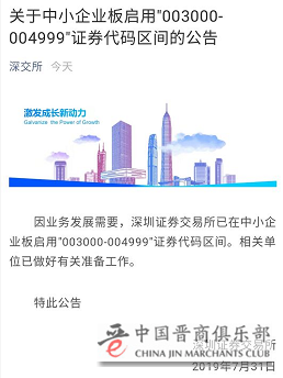 7月31日,深交所发布公告称,因业务发展需要,深交所已在中小板启用“003000-004999”证券代码区间。
