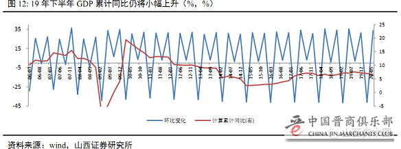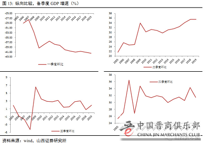 分季度观测各季度当季GDP增速。2005年以来,第二季度GDP增速持续上升;三季度GDP增速2010年之后震荡下行,在2018年达到最低点,2019年第三季度GDP增速料将上升;四季度GDP增速在2010年之后保持震荡波动态势,预计19年四季度GDP增速仍将处于高位波动态势。
