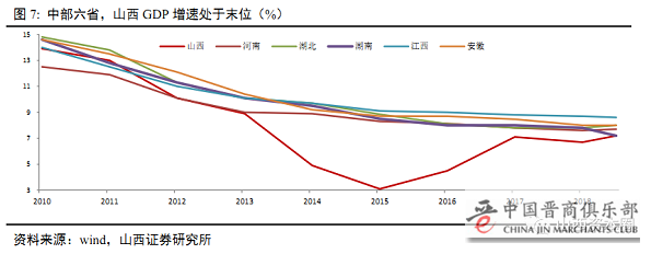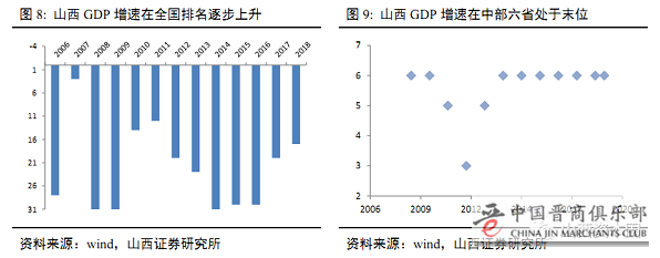 上半年,山西GDP同比增长7.2%,较全国同期GDP增速高出0.9pct。本轮经济周期以来,山西省GDP增速持续上升,2015年山西GDP增速排名30位,18年底排名为17位,上升13位,增速从15年低点开始逐步回升,供给侧结构改革卓有成效。中部六省来看,山西GDP增速仍处于末位,改革需要持续发力。上半年GDP增速7.2%,与湖南并列排名最末。2009年以来,山西GDP增速持续位于中部六省之末,仅在2010-2012年间有所改变,分别排名5/3/5位。