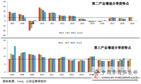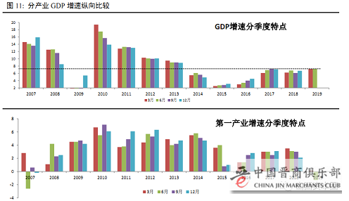 分产业来看,分别观测一产、二产、三产在每个季度的增速。观测可知,19年第一产业增长与2007年呈现出较大的相似性,类比可得第一产业三季度、四季度仍将处于低位增长状态;19年第二产业增长已经走出14年以来的弱势增长状态,预计第二产业三季度、四季度表现仍将不俗;19年第三产业三季度、四季度预计仍将保持高位增长。