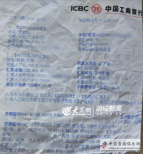 一位名叫黄超阳的人通过银行转账给了20万“补助金”